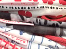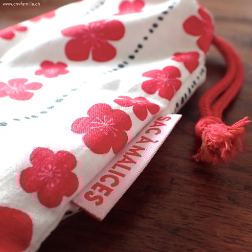 - 1 sac bariolé, cousu artisanalement avec amour et imperfections en Suisse, format environ 9x15 cm, muni d'un cordon rouge et d'une charmante étiquette brodée.
